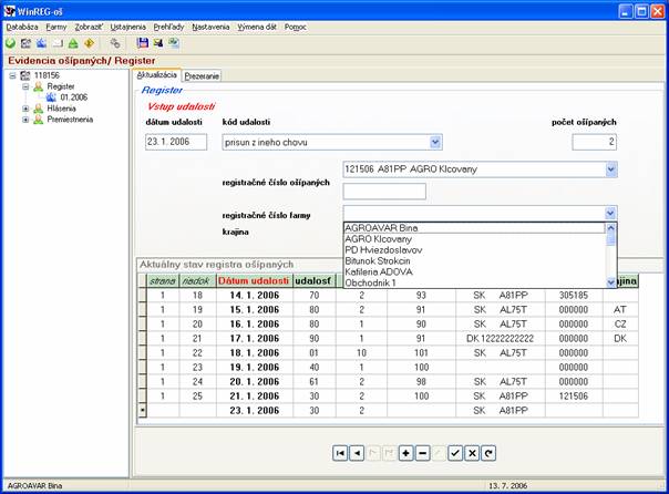 V tzv. strome údajovej štruktúry sa zobrazí registračné číslo vybranej farmy a aplikácia je pripravená na prácu s vybranou farmou.